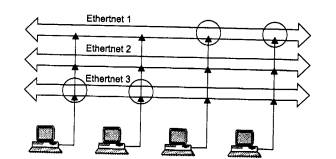 Рис. 4.9. Искажение поля данных в кадрах, не предназначенных для приема станциями Многосегментные концентраторыПри рассмотрении некоторых моделей концентраторов возникает вопрос - зачем в этой модели имеется такое большое количество портов, например 192 или 240? Имеет ли смысл разделять среду в 10 или 16 Мбит/с между таким большим количеством станций? Возможно, десять - пятнадцать лет назад ответ в некоторых случаях мог бы быть и положительным, например, для тех сетей, в которых компьютеры пользовались сетью только для отправки небольших почтовых сообщений или для переписывания небольшого текстового файла. Сегодня таких сетей осталось крайне мало, и даже 5 компьютеров могут полностью загрузить сегмент Ethernet или Token Ring, a в некоторых случаях - и сегмент Fast Ethernet. Для чего же тогда нужен концентратор с большим количеством портов, если ими практически нельзя воспользоваться из-за ограничений по пропускной способности, приходящейся на одну станцию? Ответ состоит в том, что в таких концентраторах имеется несколько несвязанных внутренних шин, которые предназначены для создания нескольких разделяемых сред. Например, концентратор, изображенный на рис. 4.10, имеет три внутренние шины Ethernet. Если, например, в таком концентраторе 72 порта, то каждый из этих портов может быть связан с любой из трех внутренних шин. На рисунке первые два компьютера связаны с шиной Ethernet 3, а третий и четвертый компьютеры - с шиной Ethernet 1. Первые два компьютера образуют один разделяемый сегмент, а третий и четвертый - другой разделяемый сегмент.