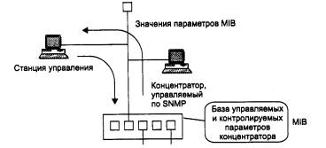 Рис. 4.10. Многосегментный концентратор Между собой компьютеры, подключенные к разным сегментам, общаться через концентратор не могут, так как шины внутри концентратора никак не связаны. Многосегментные концентраторы нужны для создания разделяемых сегментов, состав которых может легко изменяться. Большинство многосегментных концентраторов, например System 5000 компании Nortel Networks или PortSwitch Hub компании 3Com, позволяют выполнять операцию соединения порта с одной из внутренних шин чисто программным способом, например с помощью локального конфигурирования через консольный порт, В результате администратор сети может присоединять компьютеры пользователей к любым портам концентратора, а затем с помощью программы конфигурирования концентратора управлять составом каждого сегмента. Если завтра сегмент 1 станет перегруженным, то его компьютеры можно распределить между оставшимися сегментами концентратора. Возможность многосегментного концентратора программно изменять связи портов с внутренними шинами называется конфигурационной коммутацией (configuration switching). ВНИМАНИЕ Конфигурационная коммутация не имеет ничего общего с коммутацией кадров, которую выполняют мосты и коммутаторы. Многосегментные концентраторы - это программируемая основа больших сетей. Для соединения сегментов между собой нужны устройства другого типа - мосты/коммутаторы или маршрутизаторы. Такое межсетевое устройство должно подключаться к нескольким портам многосегментного концентратора, подсоединенным к разным внутренним шинам, и выполнять передачу кадров или пакетов между сегментами точно так же, как если бы они были образованы отдельными устройствами-концентраторами. Для крупных сетей многосегментный концентратор играет роль интеллектуального кроссового шкафа, который выполняет новое соединение не за счет механического перемещения вилки кабеля в новый порт, а за счет программного изменения внутренней конфигурации устройства. Управление концентратором по протоколу SNMPКак видно из описания дополнительных функций, многие из них требуют конфигурирования концентратора. Это конфигурирование может производиться локально, через интерфейс RS-232C, который имеется у любого концентратора, имеющего блок управления. Кроме конфигурирования в большой сети очень полезна функция наблюдения за состоянием концентратора: работоспособен ли он, в каком состоянии находятся его порты. При большом количестве концентраторов и других коммуникационных устройств в сети постоянное наблюдение за состоянием многочисленных портов и изменением их параметров становится очень обременительным занятием, если оно должно выполняться с помощью локального подключения терминала. Поэтому большинство концентраторов, поддерживающих интеллектуальные дополнительные функции, могут управляться централизованно по сети с помощью популярного протокола управления SNMP (Simple Network Management Protocol) из стека TCP/IP. Упрощенная структура системы управления изображена на рис.4.11.
