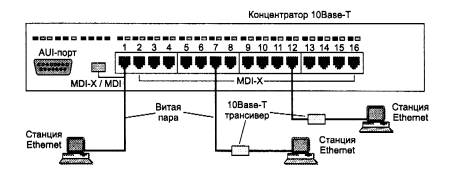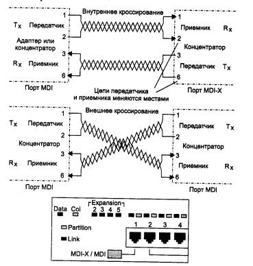 Рис. 4.5. Концентратор Ethernet Для соединения концентраторов технологии 10Base-T между собой в иерархическую систему коаксиальный или оптоволоконный кабель не обязателен, можно применять те же порты, что и для подключения конечных станций, с учетом одного обстоятельства. Дело в том, что обычный порт RJ-45, предназначенный для подключения сетевого адаптера и называемый MDI-X (кроссированный MDI), имеет инвертированную разводку контактов разъема, чтобы сетевой адаптер можно было подключить к концентратору с помощью стандартного соединительного кабеля, не кроссирующего контакты (рис. 4.6). В случае соединения концентраторов через стандартный порт MDI-X приходится использовать нестандартный кабель с перекрестным соединением пар. Поэтому некоторые изготовители снабжают концентратор выделенным портом MDI, в котором нет кроссирования пар. Таким образом, два концентратора можно соединить обычным некроссированным кабелем, если это делать через порт MDI-X одного концентратора и порт MDI второго. Чаще один порт концентратора может работать и как порт MDI-X, и как порт MDI, в зависимости от положения кнопочного переключателя, как это показано в нижней части рис. 4.6.