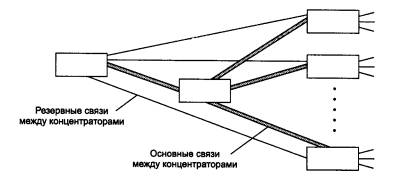 Поддержка резервных связейТак как использование резервных связей в концентраторах определено только в стандарте FDDI, то для остальных стандартов разработчики концентраторов поддерживают такую функцию с помощью своих частных решений. Например, концентраторы Ethernet/Fast Ethernet могут образовывать только иерархические связи без петель. Поэтому резервные связи всегда должны соединять отключенные порты, чтобы не нарушать логику работы сети. Обычно при конфигурировании концентратора администратор должен определить, какие порты являются основными, а какие по отношению к ним - резервными (рис. 4.7). Если по какой-либо причине порт отключается (срабатывает механизм автосегментации), концентратор делает активным его резервный порт.