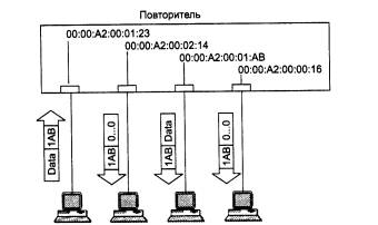 Рис. 4.8. Изоляция портов: передача кадров только от станций с фиксированными адресами Заметим, что для реализации описанного метода защиты данных концентратор нужно предварительно сконфигурировать. Для этого концентратор должен иметь блок управления. Такие концентраторы обычно называют интеллектуальными. Блок управления представляет собой компактный вычислительный блок со встроенным программным обеспечением. Для взаимодействия администратора с блоком управления концентратор имеет консольный порт (чаще всего RS-232), к которому подключается терминал или персональный компьютер с программой эмуляции терминала. При присоединении терминала блок управления организует на его экране диалог, с помощью которого администратор вводит значения МАС - адресов. Блок управления может поддерживать и другие операции конфигурирования, например ручное отключение или включение портов и т. д. Для этого при подключении терминала блок управления выдает на экран некоторое меню, с помощью которого администратор выбирает нужное действие. Другим способом защиты данных от несанкционированного доступа является их шифрация. Однако процесс истинной шифрации требует большой вычислительной мощности, и для повторителя, не буферизующего кадр, выполнить шифрацию «на лету» весьма сложно. Вместо этого в концентраторах применяется метод случайного искажения поля данных в пакетах, передаваемых портам с адресом, отличным от адреса назначения пакета. Этот метод сохраняет логику случайного доступа к среде, так как все станции видят занятость среды кадром информации, но только станция, которой послан этот кадр, может понять содержание поля данных кадра (рис. 4.9). Для реализации этого метода концентратор также нужно снабдить информацией о том, какие МАС - адреса имеют станции, подключенные к его портам. Обычно поле данных в кадрах, направляемых станциям, отличным от адресата, заполняется нулями.