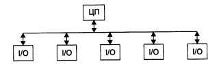 Рис. 4.30. Коммутатор на процессоре общего назначения Основным недостатком таких коммутаторов была их низкая скорость. Универсальный процессор никак не мог справиться с большим объемом специализированных операций по пересылке кадров между интерфейсными модулями. Для ускорения операций коммутации нужны были специализированные процессоры со специализированными средствами обмена данными, как в первом коммутаторе Kalpana, и они вскоре появились. Сегодня все коммутаторы используют заказные специализированные БИС - ASIC, которые оптимизированы для выполнения основных операций коммутации. Часто в одном коммутаторе используется несколько специализированных БИС, каждая из которых выполняет функционально законченную часть операций. Сравнительно низкая стоимость современных коммутаторов по сравнению с их предшественниками 3-5-летней давности объясняется массовым характером производства основных БИС, на которых каждая компания строит свои коммутаторы. Кроме процессорных микросхем для успешной неблокирующей работы коммутатору нужно также иметь быстродействующий узел для передачи кадров между процессорными микросхемами портов. В настоящее время коммутаторы используют в качестве базовой одну из трех схем, на которой строится такой узел обмена: