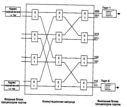 Рис. 4.31. Коммутационная матрица Более детальное представление одного из возможных вариантов реализации коммутационной матрицы для 8 портов дано на рис. 4.32. Входные блоки процессоров портов на основании просмотра адресной таблицы коммутатора определяют по адресу назначения номер выходного порта. Эту информацию они добавляют к байтам исходного кадра в виде специального ярлыка - тэга (tag). Для данного примера тэг представляет собой просто 3-разрядное двоичное число, соответствующее номеру выходного порта.