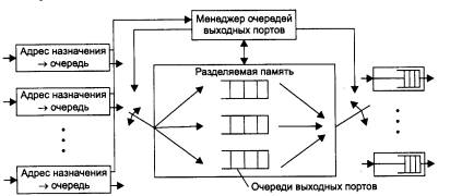 Рис. 4.34. Архитектура разделяемой памяти Входные блоки процессоров портов соединяются с переключаемым входом разделяемой памяти, а выходные блоки этих же процессоров соединяются с переключаемым выходом этой памяти. Переключением входа и выхода разделяемой памяти управляет менеджер очередей выходных портов. В разделяемой памяти менеджер организует несколько очередей данных, по одной для каждого выходного порта. Входные блоки процессоров передают менеджеру портов запросы на запись данных в очередь того порта, который соответствует адресу назначения пакета. Менеджер по очереди подключает вход памяти к одному из входных блоков процессоров и тот переписывает часть данных кадра в очередь определенного выходного порта. По мере заполнения очередей менеджер производит также поочередное подключение выхода разделяемой памяти к выходным блокам процессоров портов, и данные из очереди переписываются в выходной буфер процессора. Память должна быть достаточно быстродействующей для поддержания скорости переписи данных между N портами коммутатора. Применение общей буферной памяти, гибко распределяемой менеджером между отдельными портами, снижает требования к размеру буферной памяти процессора порта. Комбинированные коммутаторыУ каждой из описанных архитектур есть свои преимущества и недостатки, поэтому часто в сложных коммутаторах эти архитектуры применяются в комбинации друг с другом. Пример такого комбинирования приведен на рис. 4.35.