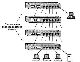Первый тип коммутаторов обычно предназначен для организации небольших рабочих групп. Модульные коммутаторы на основе шасси чаще всего предназначены для применения на магистрали сети. Поэтому они выполняются на основе какой-либо комбинированной схемы, в которой взаимодействие модулей организуется по быстродействующей шине или же на основе быстрой разделяемой памяти большого объема. Модули такого коммутатора выполняются на основе технологии «hot swap», то есть допускают замену на ходу, без выключения коммутатора, так как центральное коммуникационное устройство сети не должно иметь перерывов в работе. Шасси обычно снабжается резервированными источниками питания и резервированными вентиляторами в тех же целях. С технической точки зрения определенный интерес представляют стековые коммутаторы. Эти устройства представляют собой коммутаторы, которые могут работать автономно, так как выполнены в отдельном корпусе, но имеют специальные интерфейсы, которые позволяют их объединять в общую систему, работающую как единый коммутатор. Говорят, что в этом случае отдельные коммутаторы образуют стек. Обычно такой специальный интерфейс представляет собой высокоскоростную шину, которая позволяет объединить отдельные корпуса подобно модулям в коммутаторе на основе шасси. Так как расстояния между корпусами больше, чем между модулями на шасси, скорость обмена по шине обычно ниже, чем у модульных коммутаторов: 200-400 Мбит/с. Не очень высокие скорости обмена между коммутаторами стека обусловлены также тем, что стековые коммутаторы обычно занимают промежуточное положение между коммутаторами с фиксированным количеством портов и коммутаторами на основе шасси. Стековые коммутаторы применяются для создания сетей рабочих групп и отделов, поэтому сверхвысокие скорости шин обмена им не очень нужны и не соответствуют их ценовому диапазону. Структура стека коммутаторов, соединяемых по скоростным специальным портам, показана на рис. 4.36.