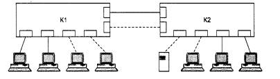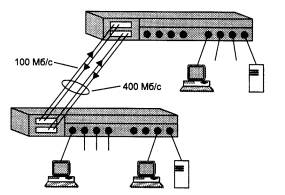Рис. 4.36. Стек коммутаторов, объединяемых по высокоскоростным каналам Компания Cisco предложила другой подход к организации стека. Ее коммутатор Catalyst 3000 также имеет специальный скоростной интерфейс 280 Мбит/с для организации стека, но с его помощью коммутаторы соединяются не друг с другом, а с отдельным устройством, содержащим коммутационную матрицу 8х8, организующую более высокопроизводительный обмен между любыми парами коммутаторов. Существуют коммутаторы, которые позволяют объединить два коммутатора полнодуплексным каналом более чем по одной паре портов. Например, коммутаторы модели 28115 компании Nortel Networks имеют по два порта Fast Ethernet, с помощью которых можно соединять коммутаторы, образуя полнодуплексный канал с производительностью 400 Мбит/с (рис. 4.37).