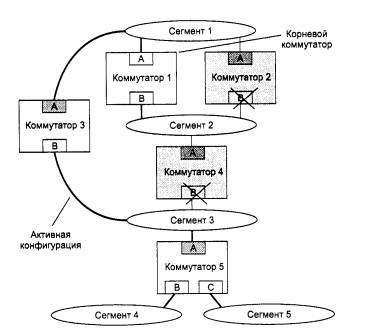 Понятие расстояния играет важную роль в построении покрывающего дерева. Именно по этому критерию выбирается единственный порт, соединяющий каждый коммутатор с корневым коммутатором, и единственный порт, соединяющий каждый сегмент сети с корневым коммутатором. На рис. 4.38 показан пример построения конфигурации покрывающего дерева для сети, состоящей из 5 сегментов и 5 коммутаторов. Корневые порты закрашены темным цветом, назначенные порты не закрашены, а заблокированные порты перечеркнуты. В активной конфигурации коммутаторы 2 и 4 не имеют портов, передающих кадры данных, поэтому они закрашены как резервные.