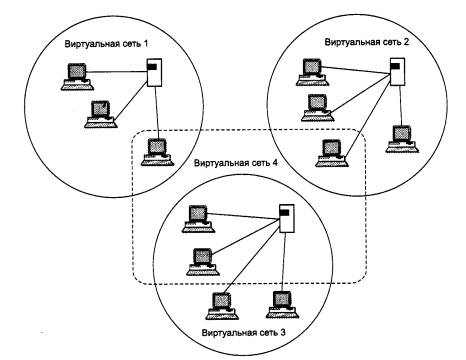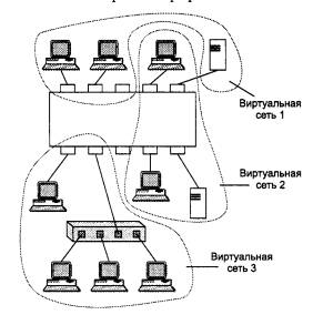 Для связи виртуальных сетей в общую сеть требуется привлечение сетевого уровня. Он может быть реализован в отдельном маршрутизаторе, а может работать и в составе программного обеспечения коммутатора, который тогда становится комбинированным устройством - так называемым коммутатором 3-го уровня. Коммутаторы 3-го уровня рассматриваются в главе 5. Технология образования и работы виртуальных сетей с помощью коммутаторов долгое время не стандартизировалась, хотя и была реализована в очень широком спектре моделей коммутаторов разных производителей. Такое положение изменилось после принятия в 1998 году стандарта IEEE 802.1Q, который определяет базовые правила построения виртуальных локальных сетей, не зависящие от протокола канального уровня, который поддерживает коммутатор. В виду долгого отсутствия стандарта на VLAN каждый крупный производитель коммутаторов разработал свою технологию виртуальных сетей, которая, как правило, была несовместима с технологиями других производителей. Поэтому, несмотря на появление стандарта, можно не так уж редко встретиться с ситуацией, когда виртуальные сети, созданные на коммутаторах одного производителя, не распознаются и, соответственно, не поддерживаются коммутаторами другого производителя. При создании виртуальных сетей на основе одного коммутатора обычно используется механизм группирования в сети портов коммутатора (рис. 4.41). При этом каждый порт приписывается той или иной виртуальной сети. Кадр, пришедший от порта, принадлежащего, например, виртуальной сети 1, никогда не будет передан порту, который не принадлежит этой виртуальной сети. Порт можно приписать нескольким виртуальным сетям, хотя на практике так делают редко - пропадает эффект полной изоляции сетей.