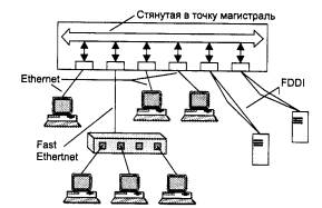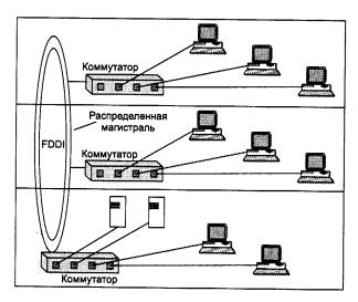 Рис. 4.44. Структура сети со стянутой в точку магистралью Преимуществом такой структуры является высокая производительность магистрали. Так как для коммутатора производительность внутренней шины или схемы общей памяти, объединяющей модули портов, в несколько гигабит в секунду не является редкостью, то магистраль сети может быть весьма быстродействующей, причем ее скорость не зависит от применяемых в сети протоколов и может быть повышена с помощью замены одной модели коммутатора на другую. Положительной чертой такой схемы является не только высокая скорость магистрали, но и ее протокольная независимость. На внутренней магистрали коммутатора в независимом формате одновременно могут передаваться данные различных протоколов, например Ethernet, FDDI и Fast Ethernet, как это изображено на рис. 4.44 Подключение нового узла с новым протоколом часто требует не замены коммутатора, а просто добавления соответствующего интерфейсного модуля, поддерживающего этот протокол. Если к каждому порту коммутатора в такой схеме подключен только один узел, то такая схема будет соответствовать микросегментированной сети. Распределенная магистраль на коммутаторахВ сетях больших зданий или кампусов структура с коллапсированной магистралью не всегда рациональна или возможна. Такая структура приводит к протяженным кабельным системам, связывающим конечные узлы или коммутаторы сетей рабочих групп с центральным коммутатором, шина которого и является магистралью сети. Высокая плотность кабелей и их высокая стоимость ограничивают применение стянутой в точку магистрали в таких сетях. Иногда, особенно в сетях кампусов, просто невозможно стянуть все кабели в одно помещение из-за ограничений на длину связей, накладываемых технологией (например, все реализации технологий локальных сетей на витой паре ограничивают протяженность кабелей в 100 м). Поэтому в локальных сетях, покрывающих большие территории, часто используется другой вариант построения сети - с распределенной магистралью. Пример такой сети приведен на рис. 4.45.
