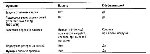 Как скорость фильтрации, так и скорость продвижения измеряются обычно в кадрах в секунду. Если в характеристиках коммутатора не уточняется, для какого протокола и для какого размера кадра приведены значения скоростей фильтрации и продвижения, то по умолчанию считается, что эти показатели даются для протокола Ethernet и кадров минимального размера, то есть кадров длиной 64 байт (без преамбулы) с полем данных в 46 байт. Если скорости указаны для какого-либо определенного протокола, например Token Ring или FDDI, то они также даны для кадров минимальной длины этого протокола (например, кадров длины 29 байт для протокола FDDI). Применение в качестве основного показателя скорости работы коммутатора кадров минимальной длины объясняется тем, что такие кадры всегда создают для коммутатора наиболее тяжелый режим работы по сравнению с кадрами другого формата при равной пропускной способности переносимых пользовательских данных. Поэтому при проведении тестирования коммутатора режим передачи кадров минимальной длины используется как наиболее сложный тест, который должен проверить способность коммутатора работать при наихудшем сочетании параметров трафика. Кроме того, для пакетов минимальной длины скорость фильтрации и продвижения максимальна, что имеет немаловажное значение при рекламе коммутатора. Пропускная способность коммутатора измеряется количеством пользовательских данных (в мегабитах в секунду), переданных в единицу времени через его порты. Так как коммутатор работает на канальном уровне, для него пользовательскими данными являются те данные, которые переносятся в поле данных кадров протоколов канального уровня - Ethernet, Token Ring, FDDI и т. п. Максимальное значение пропускной способности коммутатора всегда достигается на кадрах максимальной длины, так как при этом доля накладных расходов на служебную информацию кадра гораздо ниже, чем для кадров минимальной длины, а время выполнения коммутатором операций по обработке кадра, приходящееся на один байт пользовательской информации, существенно меньше. Поэтому коммутатор может быть блокирующим для кадров минимальной длины, но при этом иметь очень хорошие показатели пропускной способности. Задержка передачи кадра измеряется как время, прошедшее с момента прихода первого байта кадра на входной порт коммутатора до момента появления этого байта на его выходном порту. Задержка складывается из времени, затрачиваемого на буферизацию байт кадра, а также времени, затрачиваемого на обработку кадра коммутатором, - просмотра адресной таблицы, принятия решения о фильтрации или продвижении и получения доступа к среде выходного порта. Величина вносимой коммутатором задержки зависит от режима его работы. Если коммутация осуществляется «на лету», то задержки обычно невелики и составляют от 5 до 40 мкс, а при полной буферизации кадров - от 50 до 200 мкс (для кадров минимальной длины). Коммутатор - это многопортовое устройство, поэтому для него принято все приведенные выше характеристики (кроме задержки передачи кадра) давать в двух вариантах. Первый вариант - суммарная производительность коммутатора при одновременной передаче трафика по всем его портам, второй вариант - производительность, приведенная в расчете на один порт. Обычно производители коммутаторов указывают общую максимальную пропускну