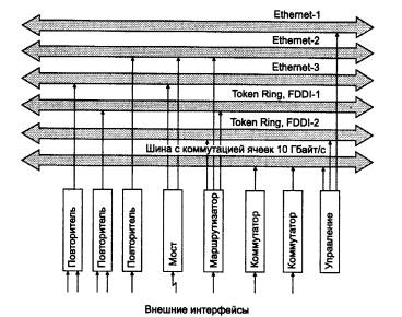 Разделение функций построения и использования таблицы маршрутизации. Основная вычислительная работа проводится маршрутизатором при составлении таблицы маршрутизации с маршрутами ко всем известным ему сетям. Эта работа состоит в обмене пакетами протоколов маршрутизации, такими как RIP или OSPF, и вычислении оптимального пути к каждой целевой сети по некоторому критерию. Для вычисления оптимального пути на графе, как того требуют протоколы состояния связей, необходимы значительные вычислительные мощности. После того как таблица маршрутизации составлена, функция продвижения пакетов происходит весьма просто - осуществляется просмотр таблицы и поиск совпадения полученного адреса с адресом целевой сети. Если совпадение есть, то пакет передается на соответствующий порт маршрутизатора. Некоторые маршрутизаторы поддерживают только функции продвижения пакетов по готовой таблице маршрутизации. Такие маршрутизаторы являются усеченными маршрутизаторами, так как для их полноценной работы требуется наличие полнофункционального маршрутизатора, у которого можно взять готовую таблицу маршрутизации. Этот маршрутизатор часто называется сервером маршрутов. Отказ от самостоятельного выполнения функций построения таблицы маршрутизации резко удешевляет маршрутизатор и повышает его производительность. Примерами такого подхода являются маршрутизаторы NetBuilder компании 3Com, поддерживающие фирменную технологию Boundary Routing, маршрутизирующие коммутаторы Catalyst 5000 компании Cisco Systems. 5.6.2. Корпоративные модульные концентраторыБольшинство крупных фирм-производителей сетевого оборудования предлагает модульные концентраторы в качестве «коммутационного центра» корпоративной сети. Такие концентраторы отражают тенденцию перехода от полностью распределенных локальных сетей 70-х годов на коаксиальном кабеле к централизованным коммуникационным решениям, активно воздействующим на передачу пакетов между сегментами и сетями. Модульные корпоративные концентраторы представляют собой многофункциональные устройства, которые могут включать несколько десятков модулей различного назначения: повторителей разных технологий, коммутаторов, удаленных мостов, маршрутизаторов и т. п., которые объединены в одном устройстве с модулями-агентами протокола SNMP, и, следовательно, позволяют централизованно объединять, управлять и обслуживать большое количество устройств и сегментов, что очень удобно в сетях большого размера. Модульный концентратор масштаба предприятия обычно обладает внутренней шиной или набором шин очень высокой производительности - до нескольких десятков гигабит в секунду, что позволяет реализовать одновременные соединения между модулями с высокой скоростью, гораздо большей, чем скорость внешних интерфейсов модулей. Основная идея разработчиков таких устройств заключается в создании программно настраиваемой конфигурации связей в сети, причем сами связи между устройствами и сегментами могут также поддерживаться с помощью различных методов: побитовой передачи данных повторителями, передачи кадров коммутаторами и передачи пакетов сетевых протоколов маршрутизаторами. Пример структуры корпоративного концентратора приведен на рис. 5.30. Он имеет несколько шин для образования независимых разделяемых сегментов Ethernet 10 Мбит/с, Tok