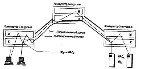 Рис. 5.31. Ускоренная маршрутизация потока пакетов В схеме ускоренной маршрутизации такую обработку проходит только несколько первых пакетов долговременного потока, то есть классическая схема работает до тех пор, пока долговременный поток не будет выявлен. После этого первый коммутатор на пути следования потока выполняет нестандартную обработку пакета - он помещает в кадр канального протокола, например Ethernet, не МАС - адрес порта следующего маршрутизатора, а МАС - адрес узла назначения, который на рисунке обозначен как МАСк. Как только эта замена произведена, кадр с таким МАС - адресом перестает поступать на блоки маршрутизации второго и третьего коммутатора/маршрутизатора, а проходит только через блоки коммутации этих устройств. Процесс передачи пакетов действительно ускоряется, так как они не проходят многократно повторяющиеся этапы маршрутизации. В то же время защитные свойства маршрутизаторы сохраняют, так как первые пакеты проверяются на допустимость передачи в сеть назначения, поэтому сохраняются фильтрация широковещательного шторма, защита от несанкционированного доступа и другие преимущества сети, разделенной на подсети. Для реализации описанной схемы нужно решить несколько проблем. Первая - на основании каких признаков определяется долговременный поток. Это достаточно легкая проблема, и основные подходы к ее решению очевидны - совпадение адресов и портов соединения, общие признаки качества обслуживания, некоторый порог одинаковых пакетов для фиксации долговременное ™. Вторая проблема более серьезная. На основании какой информации первый маршрутизатор узнает МАС - адрес узла назначения. Этот узел находится за пределами непосредственно подключенных к первому маршрутизатору сетей, поэтому использование протокола ARP здесь не поможет. Именно здесь расходятся пути большинства фирменных технологий ускоренной маршрутизации. Многие компании разработали собственные служебные протоколы, с помощью которых маршрутизаторы запрашивают этот МАС - адрес друг у друга, пока последний на пути маршрутизатор не выяснит его с помощью протокола ARP. Фирменные протоколы используют как распределенный подход, когда все маршрутизаторы равны в решении проблемы нахождения МАС - адреса, так и централизованный, когда в сети существует выделенный маршрутизатор, который помогает ее решить для всех. Примерами коммутаторов 3-го уровня, работающими по схеме ускоренной IP-маршрутизации, являются коммутаторы Smart-Switch компании Cabletron, а также коммутатор Catalyst 5000 компании Cisco, выполняющий свои функции совместно с маршрутизаторами Cisco 7500 по технологии Cisco NetFlow для распознавания потоков и определения их адресной информации, и ряд других. Выводы
