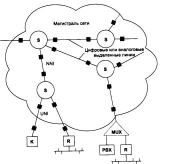 Рис. 6.2. Пример структуры глобальной сети Сеть строится на основе некоммутируемых (выделенных) каналов связи, которые соединяют коммутаторы глобальной сети между собой. Коммутаторы называют также центрами коммутации пакетов (ЦКП), то есть они являются коммутаторами пакетов, которые в разных технологиях глобальных сетей могут иметь и другие названия - кадры, ячейки cell. Как и в технологиях локальных сетей принципиальной разницы между этими единицами данных нет, однако в некоторых технологиях есть традиционные названия, которые к тому же часто отражают специфику обработки пакетов. Например, кадр технологии frame relay редко называют пакетом, поскольку он не инкапсулируется в кадр или пакет более низкого уровня и обрабатывается протоколом канального уровня. Коммутаторы устанавливаются в тех географических пунктах, в которых требуется ответвление или слияние потоков данных конечных абонентов или магистральных каналов, переносящих данные многих абонентов. Естественно, выбор мест расположения коммутаторов определяется многими соображениями, в которые включается также возможность обслуживания коммутаторов квалифицированным персоналом, наличие выделенных каналов связи в данном пункте, надежность сети, определяемая избыточными связями между коммутаторами. Абоненты сети подключаются к коммутаторам в общем случае также с помощью выделенных каналов связи. Эти каналы связи имеют более низкую пропускную способность, чем магистральные каналы, объединяющие коммутаторы, иначе сеть бы не справилась с потоками данных своих многочисленных пользователей. Для подключения конечных пользователей допускается использование коммутируемых каналов, то есть каналов телефонных сетей, хотя в таком случае качество транспортных услуг обычно ухудшается. Принципиально замена выделенного канала на коммутируемый ничего не меняет, но вносятся дополнительные задержки, отказы и разрывы канала по вине сети с коммутацией каналов, которая в таком случае становится промежуточным звеном между пользователем и сетью с коммутацией пакетов. Кроме того, в аналоговых телефонных сетях канал обычно имеет низкое качество из-за высокого уровня шумов. Применение коммутируемых каналов на магистральных связях коммутатор-коммутатор также возможно, но по тем же причинам весьма нежелательно. В глобальной сети наличие большого количества абонентов с невысоким средним уровнем трафика весьма желательно - именно в этом случае начинают в наибольшей степени проявляться выгоды метода коммутации пакетов. Если же абонентов мало и каждый из них создает трафик большой интенсивности (по сравнению с возможностями каналов и коммутаторов сети), то равномерное распределение во времени пульсаций трафика становится маловероятным и для качественного обслуживания абонентов необходимо использовать сеть с низким коэффициентом нагрузки. Конечные узлы глобальной сети более разнообразны, чем конечные узлы локальной сети. На рис. 6.2. показаны основные типы конечных узлов глобальной сети: отдельные компьютеры К, локальные сети, маршрутизаторы R и мультиплексоры MUX, которые используются для одновременной передачи по компьютерной сети данных и голоса (или изображения). Все эти устройства вырабатывают данные для передачи в глобальной сети, поэтому являются для нее устройствами 
