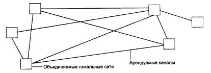 Последний случай соответствует наиболее благоприятному случаю, когда сеть с коммутацией пакетов доступна во всех географических точках, которые нужно объединить в общую корпоративную сеть. Первые два случая требуют проведения дополнительных работ, чтобы на основании взятых в аренду средств построить сеть с коммутацией пакетов. Выделенные каналыВыделенные (или арендуемые - leased) каналы можно получить у телекоммуникационных компаний, которые владеют каналами дальней связи (таких, например, как «РОСТЕЛЕКОМ»), или от телефонных компаний, которые обычно сдают в аренду каналы в пределах города или региона. Использовать выделенные линии можно двумя способами. Первый состоит в построении с их помощью территориальной сети определенной технологии, например frame relay, в которой арендуемые выделенные линии служат для соединения промежуточных, территориально распределенных коммутаторов пакетов, как в случае, приведенном на рис. 6.2. Второй вариант - соединение выделенными линиями только объединяемых локальных сетей или конечных абонентов другого типа, например мэйнфреймов, без установки транзитных коммутаторов пакетов, работающих по технологии глобальной сети (рис. 6.4). Второй вариант является наиболее простым с технической точки зрения, так как основан на использовании маршрутизаторов или удаленных мостов в объединяемых локальных сетях и отсутствии протоколов глобальных технологий, таких как Х.25 или frame relay. По глобальным каналам передаются те же пакеты сетевого или канального уровня, что и в локальных сетях.