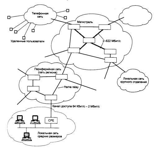 Принципы работы сетей TCP/IP уже были подробно рассмотрены в главе 5. Эти принципы остаются неизменными и при включении в состав этих сетей глобальных сетей различных технологий. Для остальных технологий, кроме SMDS, будут рассмотрены принципы доставки пакетов, пользовательский интерфейс и типы оборудования доступа к сетям данных технологий. Технология SMDS (Switched Multi-megabit Data Service) была разработана в США для объединения локальных сетей в масштабах мегаполиса, а также предоставления высокоскоростного выхода в глобальные сети. Эта технология поддерживает скорости доступа до 45 Мбит/с и сегментирует кадры МАС - уровня в ячейки фиксированного размера 53 байт, имеющие, как и ячейки технологии АТМ, поле данных в 48 байт. Технология SMDS основана на стандарте IEEE 802.6, который описывает несколько более широкий набор функций, чем SMDS. Стандарты SMDS приняты компанией Bellcore, но международного статуса не имеют. Сети SMDS были реализованы во многих крупных городах США, однако в других странах эта технология распространения не получила. Сегодня сети SMDS вытесняются сетями АТМ, имеющими более широкие функциональные возможности, поэтому в данной книге технология SMDS подробно не рассматривается. Магистральные сети и сети доступаЦелесообразно делить территориальные сети, используемые для построения корпоративной сети, на две большие категории: