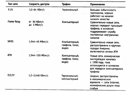 Знак «+» обозначает соединение соответствующих контактов на одной стороне кабеля. Иногда при изготовлении нуль-модемного кабеля ограничиваются только перекрестным соединением линий приемника RxD и передатчика TxD, что для некоторого программного обеспечения бывает достаточно, но в общем случае может привести к некорректной работе программ, рассчитанных на реальные модемы. Интерфейс RS-449/V.10/V.11 поддерживает более высокую скорость обмена данными и большую удаленность DCE от DTE.Этот интерфейс имеет две отдельные спецификации электрических сигналов. Спецификация RS-423/V.10 (аналогичные параметры имеет спецификация Х.26) поддерживает скорость обмена до 100000 бит/с на расстоянии до 10 ми скорость до 10000 бит/с на расстоянии до 100 м. Спецификация RS-422/V.11(X 27 поддерживает скорость до 10 Мбит/с на расстоянии до 10 ми скорость до 1 Мбит/с на расстоянии до 100 м. Как и RS-232C, интерфейс RS4 - 49 поддерживает асинхронный и синхронный режимы обмена между DTE и DCE. Для соединения используется 37-контактный разъем. Интерфейс V.35 был разработан для подключения синхронных модемов. Он обеспечивает только синхронный режим обмена между DTE и DCE на скорости до 168 Кбит/с. Для синхронизации обмена используются специальные тактирующие линии. Максимальное расстояние между DTE и DCE не превышает 15 м, как и в интерфейсе RS-232C. Интерфейс Х.21 разработан для синхронного обмена данными между DTE и DCE в сетях с коммутацией пакетов Х.25. Это достаточно сложный интерфейс, который поддерживает процедуры установления соединения в сетях с коммутацией пакетов и каналов. Интерфейс был рассчитан на цифровые DCE. Для поддержки синхронных модемов была разработана версия интерфейса Х.21 bis, которая имеет несколько вариантов спецификации электрических сигналов: RS-232C, V.10, V.I 1 и V.35. Интерфейс «токовая петля 20 л<Л» используется для увеличения расстояния между DTE и DCE. Сигналом является не потенциал, а ток величиной 20 мА, протекающий в замкнутом контуре передатчика и приемника. Дуплексный обмен реализован на двух токовых петлях. Интерфейс работает только в асинхронном режиме. Расстояние между DTE и DCE может составлять несколько километров, а скорость передачи - до 20 Кбит/с. Интерфейс HSSI (High-Speed Serial Interface) разработан для подключения к устройствам DCE, работающим на высокоскоростные каналы, такие как каналы ТЗ (45 Мбит/с), SONET ОС-1 (52 Мбит/с). Интерфейс работает в синхронном режиме и поддерживает передачу данных в диапазоне скоростей от 300 Кбит/с до 52 Мбит/с. 6.1.2. Типы глобальных сетейПриведенная на рис. 6.2 глобальная вычислительная сеть работает в наиболее подходящем для компьютерного трафика режиме - режиме коммутации пакетов. Оптимальность этого режима для связи локальных сетей доказывают не только данные о суммарном трафике, передаваемом сетью в единицу времени, но и стоимость услуг такой территориальной сети. Обычно при равенстве предоставляемой скорости доступа сеть с коммутацией пакетов оказывается в 2-3 раза дешевле, чем сеть с коммутацией каналов, то есть публичная телефонная сеть. Поэтому при создании корпоративной сети необходимо стремиться к построению или использованию услуг территориальной сети со структурой, подобной структуре, приведенной на рис. 6.2, то есть сети с территориально распределенными коммутаторами пакетов. Однако часто такая вычислительная глобальная сеть по разным причинам оказывается недос