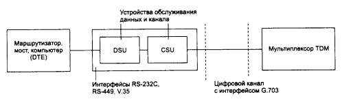 Рис. 6.6. Соединение локальных сетей или компьютеров по выделенному каналу 6.2.2. Цифровые выделенные линииЦифровые выделенные линии образуются путем постоянной коммутации в первичных сетях, построенных на базе коммутационной аппаратуры, работающей на принципах разделения канала во времени - TDM, описанного в главе 2. Существуют два поколения технологий цифровых первичных сетей - технология плезиохронной («плезио» означает «почти», то есть почти синхронной) цифровой иерархии (Plesiochronic Digital Hierarchy, PDH) и более поздняя технология - синхронная цифровая иерархия (Synchronous Digital Hierarchy, SDH). В Америке технологии SDH соответствует стандарт SONET. Технология плезиохронной цифровой иерархии PDHЦифровая аппаратура мультиплексирования и коммутации была разработана в конце 60-х годов компанией AT&T для решения проблемы связи крупных коммутаторов телефонных сетей между собой. Каналы с частотным уплотнением, применяемые до этого на участках АТС-АТС, исчерпали свои возможности по организации высокоскоростной многоканальной связи по одному кабелю. В технологии FDM для одновременной передачи данных 12 или 60 абонентских каналов использовалась витая пара, а для повышения скорости связи приходилось прокладывать кабели с большим количеством пар проводов или более дорогие коаксиальные кабели. Кроме того, метод частотного уплотнения высоко чувствителен к различного рода помехам, которые всегда присутствуют в территориальных кабелях, да и высокочастотная несущая речи сама создает помехи в приемной аппаратуре, будучи плохо отфильтрована. Для решения этой задачи была разработана аппаратура Т1, которая позволяла в цифровом виде мультиплексировать, передавать и коммутировать (на постоянной основе) данные 24 абонентов. Так как абоненты по-прежнему пользовались обычными телефонными аппаратами, то есть передача голоса шла в аналоговой форме, то мультиплексоры Т1 сами осуществляли оцифровывание голоса с частотой 8000 Гц и кодировали голос с помощью импульсно-кодовой модуляции (Pulse Code Modulation, PCM). В результате каждый абонентский канал образовывал цифровой поток данных 64 Кбит/с. Для соединения магистральных АТС каналы Т1 представляли собой слишком слабые средства мультиплексирования, поэтому в технологии была реализована идея образования каналов с иерархией скоростей. Четыре канала типа Т1 объединяются в канал следующего уровня цифровой иерархии - Т2, передающий данные со скоростью 6,312 Мбит/с, а семь каналов Т2 дают при объединении канал ТЗ, передающий данные со скоростью 44,736 Мбит/с. Аппаратура T1, T2 и ТЗ может взаимодействовать между собой, образуя иерархическую сеть с магистральными и периферийными каналами трех уровней скоростей. С середины 70-х годов выделенные каналы, построенные на аппаратуре T1, стали сдаваться телефонными компаниями в аренду на коммерческих условиях, перестав быть внутренней технологией этих компаний. Сети T1, а также более скоростные сети T2 и ТЗ позволяют передавать не только голос, но и любые данные, представленные в цифровой форме, - компьютерные данные, телевизионное изображение, факсы и т. п. Технология цифровой иерархии была позже стандартизована CCITT. При этом в нее были внесены некоторые изменения, что привело к несовместимости американской и международной версий цифровых сетей. Американская версия распространена сегодня кроме США также