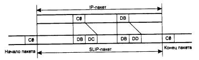 Рис. 6.13. Инкапсуляция IP-пакетов в SLIP-пакеты Хотя в спецификации протокола SLIP не определена максимальная длина передаваемого пакета, реальный размер IP-пакета не должен превышать 1006 байт. Данное ограничение связано с первой реализацией протокола SLIP в соответствующем драйвере для Berkley Unix, и его соблюдение необходимо для поддержки совместимости разных реализации SLIP (большинство современных реализации позволяют администратору самому установить размер пакета, а по умолчанию используют размер 1500 байт). Для установления связи по протоколу SLIP компьютеры должны иметь информацию об IP-адресах друг друга. Однако возможна ситуация, когда, скажем, при осуществлении соединения между хостом и маршрутизатором последнему понадобится передать хосту информацию о его IP-адресе. В протоколе SLIP нет механизмов, дающих возможность обмениваться адресной информацией. Это ограничение не позволяет использовать SLIP для некоторых видов сетевых служб. Другой недостаток SLIP - отсутствие индикации типа протокола, пакет которого инкапсулируется в SLIP-пакет. Поэтому через последовательную линию по протоколу SLIP можно передавать трафик лишь одного сетевого протокола - IP. При работе с реальными телефонными линиями, зашумленными и поэтому искажающими пакеты при пересылке, требуются процедуры обнаружения и коррекции ошибок. В протоколе SLIP такие процедуры не предусмотрены. Эти функции обеспечивают вышележащие протоколы: протокол IP проводит тестирование целостности пакета по заголовку IP, а один из двух транспортных протоколов (UDP или TCP) проверяет целостность всех данных по контрольным суммам. Низкая пропускная способность последовательных линий связи вынуждает сокращать время передачи пакетов, уменьшая объем содержащейся в них служебной информации. Эта задача решается с помощью протокола Compressed SLIP (CSLIP), поддерживающего сжатие заголовков пакетов. Появление CSLIP объясняется тем фактом, что при использовании программ типа Telnet, Riogin и других для пересылки одного байта данных требуется переслать 20-байтовый заголовок IP-пакета и 20-байтовый заголовок TCP-пакета (итого 40 байт). Спецификация CSLIP обеспечивает сжатие 40-байтового заголовка до 3-5 байт. На сегодняшний момент большинство реализации протокола SLIP поддерживают спецификацию CSLIP. Таким образом, протокол SLIP выполняет работу по выделению из последовательности передаваемых по последовательному каналу бит границ IP-пакета. Протокол не имеет механизмов передачи адресной информации, идентификации типа протокола сетевого уровня, определения и коррекции ошибок. Протоколы семейства HDLCДолгое время основным протоколом выделенных линий был протокол HDLC (High-level Data Link Control), имеющий статус стандарта ISO. Протокол HDLC на самом деле представляет собой семейство протоколов, в которое входят известные протоколы: LAP-B, образующий канальный уровень сетей Х.25, LAP-D - канальный уровень сетей ISDN, LAP-M - канальный уровень асинхронно-синхронных модемов, LAP-F - канальный уровень сетей frame relay. Основные принципы работы протокола HDLC: режим логического соединения, контроль искаженных и потерянных кадров с помощью метода скользящего окна, управление потоком кадров с помощью команд RNR и RR, а также различные типы кадров этого протокола были уже рассмотрены в главе 3 при изучении еще одного представителя семейства HDLC - протокола LLC2. Однако сегодня пр