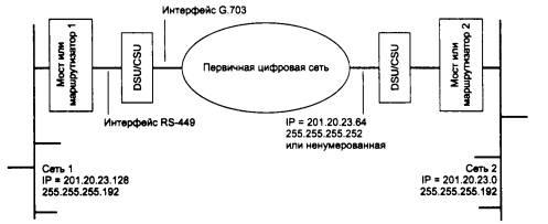 Рис. 6.14. Соединение сетей с помощью выделенного канала Некоторые устройства имеют программно настраиваемые последовательные интерфейсы, которые могут работать и как RS-449/V.11, и как RS-449/V.10, и как V.35. На рис. 6.14 выбрано в качестве примера соединение через цифровой канал Е1, поэтому мост/маршрутизатор использует для подключения к каналу устройство DSU/ CSU с внутренним интерфейсом RS-449 и внешним интерфейсом G.703. Часто крупные маршрутизаторы имеют модули со встроенным интерфейсом G.703, тогда необходимость в устройстве DSU/CSU отпадает. Если же выделенный канал был бы аналоговым, то в качестве DCE был бы необходим модем, поддерживающий режим работы по выделенной линии, причем кроме других различных критериев (скорость, контроль ошибок, компрессия) необходимо учитывать возможность модема работать по предоставленному абонентскому окончанию: 4-проводному или 2-проводному. После решения проблем физического уровня удаленные мосты готовы к работе. После включения каждый мост начинает передавать все кадры из своей локальной сети в выделенный канал и одновременно (так как практически все выделенные каналы дуплексные) принимать кадры из выделенного канала. На основании проходящего трафика каждый мост строит адресную таблицу и начинает передавать в выделенный канал кадры только тем станциям, которые действительно находятся в другой сети, а также широковещательные кадры и кадры с неизвестными МАС - адресами. Современные удаленные мосты при пересылке кадров локальных сетей упаковывают их в кадры протокола РРР. Переговорная процедура, которую ведут мосты при установлении РРР-соединения, сводится в основном к выбору параметров канального уровня с помощью протокола LPC, а также к взаимной аутентификации (если такая процедура задана в параметрах протокола РРР обоих мостов). Маршрутизатор после подключения к выделенной линии и локальной сети необходимо конфигурировать. На рис. 6.14 IP-маршрутизаторы связаны по выделенному каналу. Конфигурирование маршрутизаторов в этом случае подобно конфигурированию в локальных сетях. Каждая локальная сеть получает свой IP-адрес с соответствующей маской. Выделенный канал также является отдельной IP-сетью, поэтому можно ему также дать некоторый IP-адрес из диапазона адресов, которым распоряжается администратор корпоративной сети (в данном случае выделенному каналу присвоен адрес сети, состоящей из 2-х узлов, что определяется маской 255.255,255.252). Можно выделенному каналу и не присваивать IP-адрес - такой интерфейс маршрутизатора называется ненумерованным (unnumbered). Маршрутизатор будет нормально работать в обоих случаях. Как и в локальной сети, маршрутизаторам не нужно вручную задавать аппаратные адреса своих непосредственных соседей, так как отсылая пакеты протокола маршрутизации (RIP или OSPF) по выделенному каналу, маршрутизаторы будут их получать без проблем. Протокол ARP на выделенном канале не используется, так как аппаратные адреса на выделенном канале не имеют практического смысла (в кадре РРР есть два адреса - кадр от DCE или от DTE, но маршрутизатор всегда будет получать кадр от DCE). Как и в локальных сетях, важной характеристикой удаленных мостов/маршрутизаторов является скорость фильтрации и скорость маршрутизации пакетов, которые часто ограничиваются не внутренними возможностями устройства, а скоростью передачи 