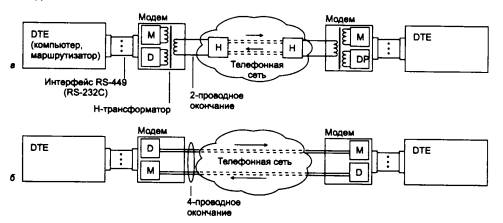 6.2. Глобальные связи на основе выделенных линийВыделенный канал - это канал с фиксированной полосой пропускания или фиксированной пропускной способностью, постоянно соединяющий двух абонентов. Абонентами могут быть как отдельные устройства (компьютеры или терминалы), так и целые сети. Выделенные каналы обычно арендуются у компаний - операторов территориальных сетей, хотя крупные корпорации могут прокладывать свои собственные выделенные каналы. Выделенные каналы делятся на аналоговые и цифровые в зависимости от того, какого типа коммутационная аппаратура применена для постоянной коммутации абонентов - FDM или TDM. На аналоговых выделенных линиях для аппаратуры передачи данных физический и канальный протоколы жестко не определены. Отсутствие физического протокола приводит к тому, что пропускная способность аналоговых каналов зависит от пропускной способности модемов, которые использует пользователь канала. Модем собственно и устанавливает нужный ему протокол физического уровня для канала. На цифровых выделенных линиях протокол физического уровня зафиксирован - он задан стандартом G.703. На канальном уровне аналоговых и цифровых выделенных каналов обычно используется один из протоколов семейства HDLC или же более поздний протокол РРР, построенный на основе HDLC для связи многопротокольных сетей. 6.2.1. Аналоговые выделенные линииТипы аналоговых выделенных линийВыделенные аналоговые каналы предоставляются пользователю с 4-проводным или 2-проводным окончанием. На каналах с 4-проводным окончанием организация полнодуплексной связи, естественно, выполняется более простыми способами. Выделенные линии могут быть разделены на две группы по другому признаку -наличию промежуточной аппаратуры коммутации и усиления или ее отсутствию. Первую группу составляют так называемые нагруженные линии, проходящие через оборудование частотного уплотнения (FDM-коммутаторы и мультиплексоры), расположенное, например, на АТС. Телефонные компании обычно предоставляют в аренду два типа выделенных каналов: канал тональной частоты с полосой пропускания 3,1 кГц и широкополосный канал с полосой 48 кГц, который представляет собой базовую группу из 12 каналов тональной частоты. Широкополосный канал имеет границы полосы пропускания от 60 до 108 кГц. Так как широкополосный канал используется для связи АТС между собой, то получение его в аренду более проблематично, чем канала тональной частоты. Выделенные нагруженные каналы также классифицируются на категории в зависимости от их качества. От категории качества зависит и арендная месячная плата за канал. Вторая группа выделенных линий - это ненагруженные физические проводные линии. Они могут кроссироваться, но при этом не проходят через аппаратуру частотного уплотнения. Часто такие линии используются для связи между близко стоящими зданиями. Разветвленные сети каналов, представляющих собой ненагруженные линии, используются, например, муниципальными службами (энергонадзора, водопровода, пожарной охраны и др.) для передачи технологической информации. При небольшой длине ненагруженной выделенной линии она обладает достаточно широкой полосой пропускания, иногда до 1 МГц, что позволяет передавать импульсные немодулированные сигналы. На первый взгляд может показаться, что ненагруженные линии не имею