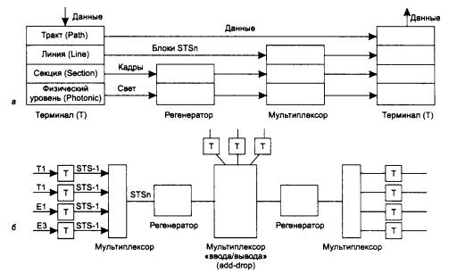 Стек протоколов и основные структурные элементы сети SONET/SDH показаны на рис. 6.7.