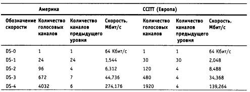 На практике в основном используются каналы Т1/Е1 и ТЗ/ЕЗ. Мультиплексор Т1 обеспечивает передачу данных 24-х абонентов со скоростью 1,544 Мбит/с в кадре, имеющем достаточно простой формат. В этом кадре последовательно передается по одному байту каждого абонента, а после 24-х байт вставляется один бит синхронизации. Первоначально устройства Т1 (которые дали имя также и всей технологии, работающей на скорости 1,544 Мбит/с) работали только на внутренних тактовых генераторах, и каждый кадр с помощью битов синхронизации мог передаваться асинхронно. Аппаратура Т1, а также более скоростная аппаратура Т2 и ТЗ за долгие годы существования претерпела значительные изменения. Сегодня мультиплексоры и коммутаторы первичной сети работают на централизованной тактовой частоте, распределяемой из одной точки всей сети. Однако принцип формирования кадра остался, поэтому биты синхронизации в кадре по-прежнему присутствуют. Суммарная скорость пользовательских каналов составляет 24 х 64 = 1,536 Мбит/с, а еще 8 Кбит/с добавляют биты синхронизации. В аппаратуре Т1 назначение восьмого бита каждого байта в кадре разное и зависит от типа передаваемых данных и поколения аппаратуры. При передаче голоса в сетях Т1 все 24 канала являются абонентскими, поэтому управляющая и контрольная информация передается восьмым (наименее значащим) битом замеров голоса. В ранних версиях сетей Т1 служебным был 8-й бит каждого байта кадра, поэтому реальная скорость передачи пользовательских данных составляла 56 Кбит/с (обычно восьмой бит отводился под такие служебные данные, как номер вызываемого телефонного абонента, сигнал занятости линии, сигнал снятия трубки и т. п.). Затем технология была улучшена и для служебных целей стали использовать только каждый шестой кадр. Таким образом, в пяти кадpax из шести пользовательские данные представлены всеми восемью битами, а в шестом - только семью. При передаче компьютерных данных канал Т1 предоставляет для пользовательских данных только 23 канала, а 24-й канал отводится для служебных целей, в основном - для восстановления искаженных кадров. Для одновременной передачи как голосовых, так и компьютерных данных используются все 24 канала, причем компьютерные данные передаются со скоростью 56 Кбит/с. Техника использования восьмого бита для служебных целей получила название «кражи бита» (bit robbing). При мультиплексирования 4-х каналов Т1 в один канал Т2 между кадрами DS-1 по-прежнему используется один бит синхронизации, а кадры DS-2 (которые состоят из 4-х последовательных кадров DS-1) разделяются 12 служебными битами, которые предназначены не только для разделения кадров, но и для их синхронизации. Соответственно, кадры DS-3 состоят из 7 кадров DS-2, разделенных служебными битами. Международная версия этой технологии описана в стандартах G.700-G.706. Она более логична, так как не использует схему «кражи бита». Кроме того, она основана на постоянном коэффициенте кратности скорости 4 при переходе к следующему уровню иерархии. Вместо восьмого бита в канале Е1 на служебные цели отводятся 2 байта из 32. Для голосовых каналов или каналов данных остается 30 каналов со скоростью передачи 64 Кбит/с каждый. Пользователь может арендовать несколько каналов 64 Кбит/с (56 Кбит/с) в канале Т1/Е1. Такой канал называется «дробным» (fractional) каналом Т1/Е1. В этом случае пользователю отводится нескол