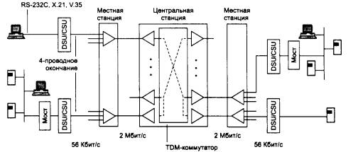 Рис. 6.15. Функционирование службы Switched 56 Абонентами обычно являются компьютеры или локальные сети, подключаемые к сети с помощью маршрутизатора или удаленного моста. Местные станции соединяются с некоторой центральной станцией, которая коммутирует цифровые потоки Т1/Е1. Сеть является полностью цифровой и поддерживает различные скорости передачи данных - от 2400 бит/с до 56 Кбит/с. Абоненты службы Switched 56 подключаются также к общей публичной телефонной сети, однако соединения со скоростью 56 Кбит/с возможны только в том случае, когда оба абонента пользуются этой службой. Стандарты службы Switched 56 разные в разных компаниях и разных странах. Сегодня этот вид службы вытесняется сетями ISDN, стандарты которых являются международными, хотя в этой области также имеются проблемы совместимости сетей разных стран. 6.3.3. ISDN - сети с интегральными услугамиЦели и история создания технологии ISDNISDN (Integrated Services Digital Network - цифровые сети с интегральными услугами) относятся к сетям, в которых основным режимом коммутации является режим коммутации каналов, а данные обрабатываются в цифровой форме. Идеи перехода телефонных сетей общего пользования на полностью цифровую обработку данных, при которой конечный абонент передает данные непосредственно в цифровой форме, высказывались давно. Сначала предполагалось, что абоненты этой сети будут передавать только голосовые сообщения. Такие сети получили название IDN - Integrated Digital Network. Термин «интегрированная сеть» относился к интеграции цифровой обработки информации сетью с цифровой передачей голоса абонентом. Идея такой сети была высказана еще в 1959 году. Затем было решено, что такая сеть должна предоставлять своим абонентам не только возможность поговорить между собой, но и воспользоваться другими услугами - в первую очередь передачей компьютерных данных. Кроме того, сеть должна была поддерживать для абонентов разнообразные услуги прикладного уровня - факсимильную связь, телетекс (передачу данных между двумя терминалами), видеотекс (получение хранящихся в сети данных на свой терминал), голосовую почту и ряд других. Предпосылки для создания такого рода сетей сложились к середине 70-х годов. К этому времени уже широко применялись цифровые каналы Т1 для передачи данных в цифровой форме между АТС, а первый мощный цифровой коммутатор телефонных каналов 4ESS был выпущен компанией Western Electric в 1976 году. В результате работ, проводимых по стандартизации интегральных сетей в CCITT, в 1980 году появился стандарт G.705, в котором излагались общие идеи такой сети. Конкретные спецификации сети ISDN появились в 1984 году в виде серии рекомендаций I. Этот набор спецификаций был неполным и не подходил для построения законченной сети. К тому же в некоторых случаях он допускал неоднозначность толкования или был противоречивым. В результате, хотя оборудование ISDN и начало появляться примерно с середины 80-х годов, оно часто было несовместимым, особенно если производилось в разных странах. В 1988 году рекомендации серии I были пересмотрены и приобрели гораздо более детальный и законченный вид, хотя некоторые неоднозначности сохранились. В 1992 и 1993 годах стандарты ISDN были еще раз пересмотрены и дополнены. Процесс стандартизации этой технологии продолжается. Внедрение сетей ISDN началось достаточно давно - с конца 80-х годов, однако высокая техническа