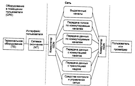 Как видно из приведенного списка, транспортные службы сетей ISDN действительно покрывают очень широкий спектр услуг, включая популярные услуги frame relay. Кроме того, большое внимание уделено средствам контроля сети, которые позволяют маршрутизировать вызовы для установления соединения с абонентом сети, а также осуществлять мониторинг и управление сетью. Управляемость сети обеспечивается интеллектуальностью коммутаторов и конечных узлов сети, поддерживающих стек протоколов, в том числе и специальных протоколов управления. Стандарты ISDN описывают также ряд услуг прикладного уровня: факсимильную связь на скорости 64 Кбит/с, телексную связь на скорости 9600 бит/с, видеотекс на скорости 9600 бит/с и некоторые другие. На практике не все сети ISDN поддерживают все стандартные службы. Служба frame relay хотя и была разработана в рамках сети ISDN, однако реализуется, как правило, с помощью отдельной сети коммутаторов кадров, не пересекающейся с сетью коммутаторов ISDN. Базовой скоростью сети ISDN является скорость канала DS-0, то есть 64 Кбит/с. Эта скорость ориентируется на самый простой метод кодирования голоса - ИКМ, хотя дифференциальное кодирование и позволяет передавать голос с тем же качеством на скорости 32 или 16 Кбит/с. Пользовательские интерфейсы ISDNОдним из базовых принципов ISDN является предоставление пользователю стандартного интерфейса, с помощью которого пользователь может запрашивать у сети разнообразные услуги. Этот интерфейс образуется между двумя типами оборудования, устанавливаемого в помещении пользователя (Customer Premises Equipment, СРЕ): терминальным оборудованием пользователя ТЕ (компьютер с соответствующим адаптером, маршрутизатор, телефонный аппарат) и сетевым окончанием NT, которое представляет собой устройство, завершающее канал связи с ближайшим коммутатором ISDN. Пользовательский интерфейс основан на каналах трех типов: