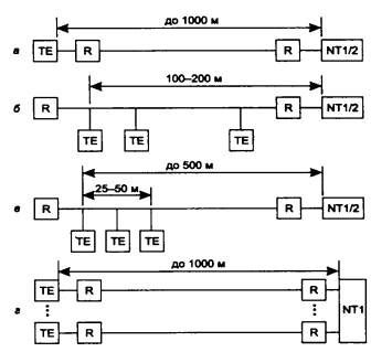 Рис. 6.18. Многоточечное подключение терминалов к сетевому окончанию Дело в том, что при небольшом количестве терминалов (ТЕ1 или ТЕ2+ТА) разрешается не использовать местную офисную АТС, а подключать до 8 устройств к одному устройству типа NT1 (или NT2 без коммутационных возможностей) с помощью схемы монтажного ИЛИ (подключение напоминает подключение станций к коаксиальному кабелю Ethernet, но только в 4-проводном варианте). При подключении одного устройства ТЕ (через терминальные резисторы R, согласующие параметры линии) к сетевому окончанию NT (см. рис. 6.18, а) длина кабеля может достигать 1000 м. При подключении нескольких устройств к пассивному кабелю (см. рис. 6.18, б) максимальная длина кабеля сокращается до 100-200 м. Правда, если эти устройства сосредоточены на дальнем конце кабеля (расстояние между ними не превышает 25-50 м), то длина кабеля может быть увеличена до 500 м (см. рис. 6.18, в). И наконец, существуют специальные многопортовые устройства NT1, которые обеспечивают звездообразное подключение до 8 устройств, при этом длина кабеля увеличивается до 1000 м (см. рис. 6.18, г). Адресация в сетях ISDNТехнология ISDN разрабатывалась как основа всемирной телекоммуникационной сети, позволяющей связывать как телефонных абонентов, так и абонентов других глобальных сетей - компьютерных, телексных. Поэтому при разработке схемы адресации узлов ISDN необходимо было, во-первых, сделать эту схему достаточно емкой для всемирный адресации, а во-вторых, совместимой со схемами адресации других сетей, чтобы абоненты этих сетей, в случае соединения своих сетей через сеть ISDN, могли бы пользоваться привычными форматами адресов. Разработчики стека TCP/IP пошли по пути введения собственной системы адресации, независимой от систем адресации объединяемых сетей. Разработчики технологии ISDN пошли по другому пути - они решили добиться использования в адресе ISDN адресов объединяемых сетей. Основное назначение ISDN - это передача телефонного трафика. Поэтому за основу адреса ISDN был взят формат международного телефонного плана номеров, описанный в стандарте ITU-T E.163. Однако этот формат был расширен для поддержки большего числа абонентов и для использования в нем адресов других сетей, например Х.25. Стандарт адресации в сетях ISDN получил номер Е.164. Формат Е.163 предусматривает до 12 десятичных цифр в номере, а формат адреса ISDN в стандарте Е.164 расширен до 55 десятичных цифр. В сетях ISDN различают номер абонента и адрес абонента. Номер абонента соответствует точке Т подключения всего пользовательского оборудования к сети. Например, вся офисная АТС может идентифицироваться одним номером ISDN. Номер ISDN состоит из 15 десятичных цифр и делится, как и телефонный номер по стандарту Е.163, на поле «Код страны» (от 1 до 3 цифр), поле «Код города» и поле «Номер абонента». Адрес ISDN включает номер плюс до 40 цифр подадреса. Подадрес используется для нумерации терминальных устройств за пользовательским интерфейсом, то есть подключенных к точке S. Например, если на предприятии имеется офисная АТС, то ей можно присвоит один номер, например 7-095-640-20-00, а для вызова абонента, имеющего подадрес 134, внешний абонент должен набрать номер 7-095-640-20-00-134. При вызове абонентов из сети, не относящейся к ISDN, их адрес может непосредственно заменять адрес ISDN. Например, адрес абонента сети Х.25, в которой используется система адресации по стандар