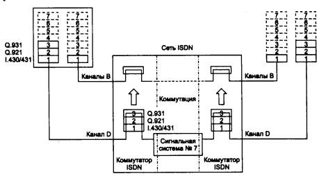 Еще одним способом вызова абонентов из других сетей является указание в адресе ISDN двух адресов: адреса ISDN пограничного устройства, например, соединяющего сеть ISDN с сетью Х.25, и адреса узла в сети Х.25. Адреса должны разделяться специальным разделителем. Два адреса используются за два этапа - сначала сеть ISDN устанавливает соединение типа коммутируемого канала с пограничным устройством, присоединенным к сети ISDN, а затем передает ему вторую часть адреса, чтобы это устройство осуществило соединение с требуемым абонентом. Стек протоколов и структура сети ISDNВ сети ISDN (рис. 6.19) существуют два стека протоколов: стек каналов типа D и стек каналов типа В.