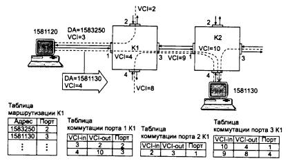 Смысл создания виртуального канала состоит в том, что маршрутизация пакетов между коммутаторами сети на основании таблиц маршрутизации происходит только один раз - при создании виртуального канала (имеется в виду создание коммутируемого виртуального канала, поскольку создание постоянного виртуального канала осуществляется вручную и не требует передачи пакетов по сети). После создания виртуального канала передача пакетов коммутаторами происходит на основании так называемых номеров или идентификаторов виртуальных каналов (Virtual Channel Identifier, VCI). Каждому виртуальному каналу присваивается значение VCI на этапе создания виртуального канала, причем это значение имеет не глобальный характер, как адрес абонента, а локальный - каждый коммутатор самостоятельно нумерует новый виртуальный канал. Кроме нумерации виртуального канала, каждый коммутатор при создании этого канала автоматически настраивает так называемые таблицы коммутации портов - эти таблицы описывают, на какой порт нужно передать пришедший пакет, если он имеет определенный номер VCI. Так что после прокладки виртуального канала через сеть коммутаторы больше не используют для пакетов этого соединения таблицу маршрутизации, а продвигают пакеты на основании номеров VCI небольшой разрядности. Сами таблицы коммутации портов также включают обычно меньше записей, чем таблицы маршрутизации, так как хранят данные только о действующих на данный момент соединениях, проходящих через данный порт.