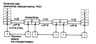 Коммутаторы (ЦКП) сетей Х.25 представляют собой гораздо более простые и дешевые устройства по сравнению с маршрутизаторами сетей TCP/IP. Это объясняется тем, что они не поддерживают процедур обмена маршрутной информацией и нахождения оптимальных маршрутов, а также не выполняют преобразований форматов кадров канальных протоколов. По принципу работы они ближе к коммутаторам локальных сетей, чем к маршрутизаторам. Однако работа, которую выполняют коммутаторы Х.25 над пришедшими кадрами, включает больше этапов, чем при продвижении кадров коммутаторами локальных сетей. Коммутатор Х.25 должен принять кадр LAP-B и ответить на него другим кадром LAP-B, в котором подтвердить получение кадра с конкретным номером. При утере или искажении кадра коммутатор должен организовать повторную передачу кадра. Если же с кадром LAP-B все в порядке, то коммутатор должен извлечь пакет Х.25, на основании номера виртуального канала определить выходной порт, а затем сформировать новый кадр LAP-B для дальнейшего продвижения пакета. Коммутаторы локальных сетей такой работой не занимаются и просто передают кадр в том виде, в котором он пришел, на выходной порт.