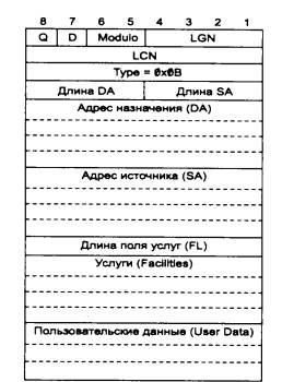 После установления соединения на канальном уровне конечный узел должен установить виртуальное соединение с другим конечным узлом сети. Для этого он в кадрах LAP-B посылает пакет Call Request протокола X.25. Формат пакета Call Request показан на рис. 6.24.