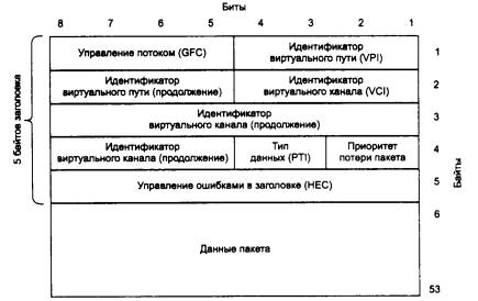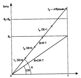 Затем данные передаются по этому соединению с запрошенной скоростью - не с большей и, в большинстве случаев, не меньшей, хотя уменьшение скорости приложением возможно, например, при передаче компрессированного голоса с помощью услуги категории CBR. Любые ячейки, передаваемые станцией с большей скоростью, контролируются первым коммутатором сети и помечаются признаком CLP=1. При перегрузках сети они могут просто отбрасываться сетью. Ячейки, которые запаздывают и не укладываются в интервал, оговоренный параметром вариации задержки CDV, также считаются мало значащими для приложения и отмечаются признаком низкого приоритета CLP=1.