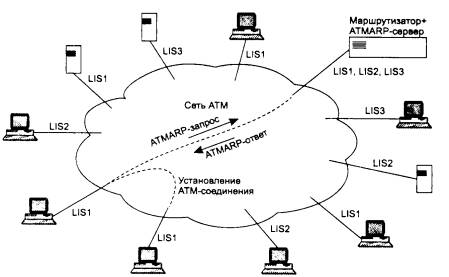 Каждый узел использует адрес АТМ сервера ATMARP, чтобы выполнить обычный запрос ARP. Этот запрос имеет формат, очень близкий к формату запроса протокола ARP из стека TCP/IP. Длина аппаратного адреса в нем определена в 20 байт, что соответствует длине адреса АТМ. В каждой логической подсети имеется свой сервер ATMARP, так как узел может обращаться без посредничества маршрутизатора только к узлам своей подсети. Обычно роль сервера ATMARP выполняет маршрутизатор, имеющий интерфейсы во всех логических подсетях.