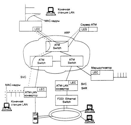 Спецификация LANE определяет способ преобразования кадров и адресов МАС - уровня традиционных технологий локальных сетей в ячейки и коммутируемые виртуальные соединения SVC технологии АТМ, а также способ обратного преобразования. Всю работу по преобразованию протоколов выполняют специальные компоненты, встраиваемые в обычные коммутаторы локальных сетей, поэтому ни коммутаторы АТМ, ни рабочие станции локальных сетей не замечают того, что они работают с чуждыми им технологиями. Такая прозрачность была одной из главных целей разработчиков спецификации LANE.