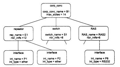 ПРИМЕЧАНИЕ Между деревом исследования и деревом включений нет прямой связи. Например, в дереве включений объект «корпоративный концентратор» может включать объекты «интерфейс Ethernet» и «модуль удаленного доступа», которые представляют модели реальных модулей, установленных в слоты корпоративного концентратора. В то же время в дереве наследования класс объектов «интерфейсы Ethernet» подчинен классу объектов «интерфейсы», а класс объектов «модуль удаленного доступа» подчинен классу «коммуникационное оборудование третьего уровня», на основании которого он порожден. Дерево имен обычно совмещается с деревом включений. Пример дерева включений показан на рис. 7.10. Экземпляр управляемого объекта класса соrр-соnс (корпоративный концентратор) имеет имя В1, а также атрибут max-slotes, описывающий максимальное количество слотов данного класса концентраторов, равный в данном случае 14. В этот объект включено ряд других объектов: объекты класса repeator, switch и RAS, которые в свою очередь включают объекты типа interface, описывающие порты модулей концентратора.