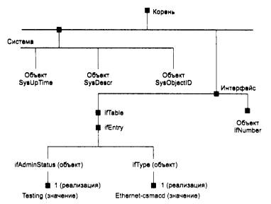 Рис. 7.6. Стандартное дерево MIB-II (фрагмент) Объект ifNumber определяет количество сетевых интерфейсов устройства, а объект ifEntry является вершиной поддерева, описывающего один из конкретных интерфейсов устройства. Входящие в это поддерево объекты ifType и ifAdminStatus определяют соответственно тип и состояние одного из интерфейсов, в данном случае интерфейса Ethernet. В число объектов, описывающих каждый конкретный интерфейс устройства, включены следующие.