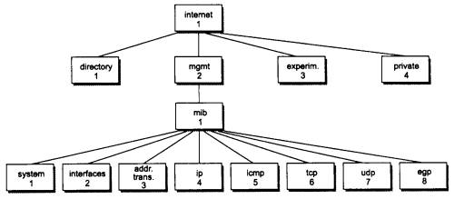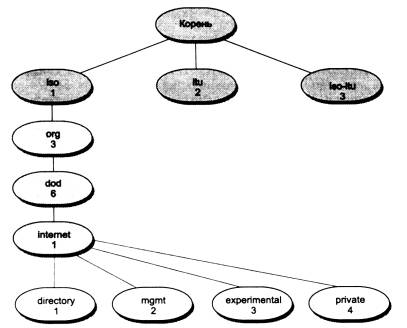 Рис. 7.7. Пространство имен объектов ISO Группа объектов private (4) зарезервирована за стандартами, создаваемыми частными компаниями, например Cisco, Hewlett-Packard и т. п. Это же дерево регистрации используется для именования классов объектов CMIP и TMN. Соответственно, каждая группа объектов MIB-I и MIB-II также имеет кроме кратких символьных имен, приведенных выше, полные символьные имена и соответствующие им числовые имена. Например, краткое символьное имя группы System имеет полную форму iso.org.dod.internet.mgmt.mib.system, а ее соответствующее числовое имя - 1.3.6.1.2.1. Часть дерева имен ISO, включающая группы объектов MIB, показана на рис. 7.8.