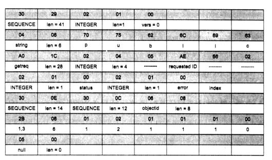 Рис. 7.8. Часть дерева имен ISO, включающая группы объектов MIB-I Формат сообщений SNMPПротокол SNMP обслуживает передачу данных между агентами и станцией, управляющей сетью. SNMP использует дейтаграммный транспортный протокол UDP, не обеспечивающий надежной доставки сообщений. Протокол, организующий надежную передачу дейтаграмм на основе соединений TCP, весьма загружает управляемые устройства, которые на момент разработки протокола SNMP были не очень мощные, поэтому от услуг протокола TCP решили отказаться. SNMP часто рассматривают только как решение для управления сетями TCP/IP. Хотя SNMP чаще всего и работает над UDP (он может также работать и над TCP), он может работать и над транспортными сетевыми протоколами стека OSI - ТРО, ТР4, CNLS, а также над протоколами МАС - уровня. Растет поддержка протокола SNMP и в других транспортных средах. Например, фирма Novell начала поддерживать протокол SNMP с версии NetWare 3.11, а некоторые производители оборудования (например, Bay Networks) реализуют в своих устройствах передачу сообщений SNMP с помощью как IP, так и IPX. Сообщения SNMP, в отличие от сообщений многих других коммуникационных протоколов, не имеют заголовков с фиксированными полями. В соответствии с нотацией ASN.1 сообщение SNMP состоит из произвольного количества полей, и каждое поле предваряется описателем его типа и размера. Любое сообщение SNMP состоит из трех основных частей: версии протокола (version), идентификатора общности (community), используемого для группирования устройств, управляемых определенным менеджером, и области данных, в которой собственно и содержатся описанные выше команды протокола, имена объектов и их значения. Область данных делится на блоки данных протокола (Protocol Data Unit, PDU). Общий формат сообщения SNMP в нотации ASN.1 выглядит следующим образом:> SNMP-Message ::= SEQUENCE { version INTEGER { version-1 (0) }, community OCTET STRING, SNMP-PDUs ANY } Область данных может содержать пять различных типов PDU, соответствующих пяти командам протокола SNMP: SNMP-PDUs :: = CHOICE { get-request GetRequest-PDU, get-next-request GetNextRequest-PDU, get-response GetResponse-PDU, set-request SetRequest-PDU, trap Trap-PDU, } И наконец, для каждого типа PDU имеется определение его формата. Например, формат блока GetRequest-PDU описан следующим образом: GetRequest-PDU ::= IMPLICIT SEQUENCE { request-id RequestID, error-status ErrorStatus, error-index Errorlndex, variable-bindings VarBindList } Далее стандарт SNMP определяет соответственно формат переменных блока GetRequest-PDU. Переменная Request ID - это 4-байтовое целое число (используется для установления соответствия ответов запросам), ErrorStatus и Errorlndex - это однобайтовые целые, которые в запросе должны быть установлены в 0. VarBindList - это список числовых имен объектов, значениями которых интересуется менеджер. В нотации ASN.1 этот список состоит из пар «имя - значение». При запросе значение переменной должно быть установлено в null. Вот пример сообщения протокола SNMP, которое представляет собой запрос о значении объекта SysDescr (числовое имя 1.3.6.1.2.1.1.1).
